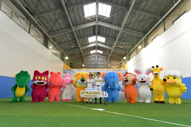 そして最後に、「らいおんくんバトンタッチだ!」と松田もバッターボックスへ。水上が投げたボールを、松田が見事にボードのど真ん中を“ヒット”させた。さらに特大のヒットをと再度挑戦した2球目――そのボールはピッチャー役の水上の頭にクリーンヒット。会場を爆笑の渦に包みながら“持ってる男”松田は3球目のチャレンジで再びボードのど真ん中をヒットさせていた。